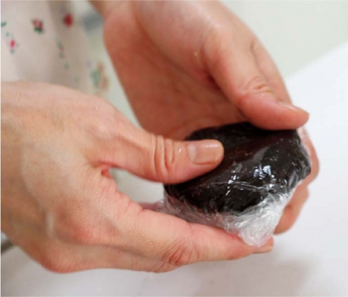 ❷粉気がなくなりまとまったら、ラップに包み形を整えて15分冷蔵庫で冷やし固める