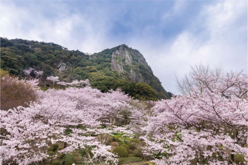 約2,000本の桜が春を彩る御船山楽園の花まつり。雄大な岩肌を背景に咲く美しい桜、夜のライトアップでは水面を彩る水灯篭とともに描き出す合わせ鏡のような幻想的な夜桜を楽しむことができる。期間中、限定公開される「萩野尾御茶屋」では、昼は串団子、夜はぜんざいを味わえる。