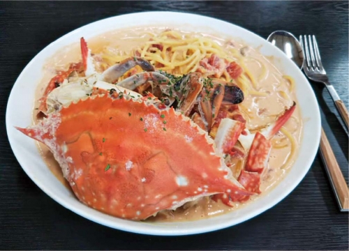 かにのうまみをダイレクトに味わえる濃厚でクリーミーな「渡りかにのトマトクリームパスタ」(2,000円)は1日10食限定。+150円でバケット、+330円でサラダ、+600円でミニ海鮮丼を追加することも