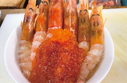 プリプリの甘い赤えびの上にいくらやとびこが乗った「赤えび丼」(1,700円)。えび好きにはたまらない
