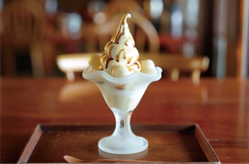 呉豆腐や豆腐白玉、豆乳ソフトクリームに黒蜜黄粉をトッピングした「平川屋パフェ」(1,200円)は、イートイン限定